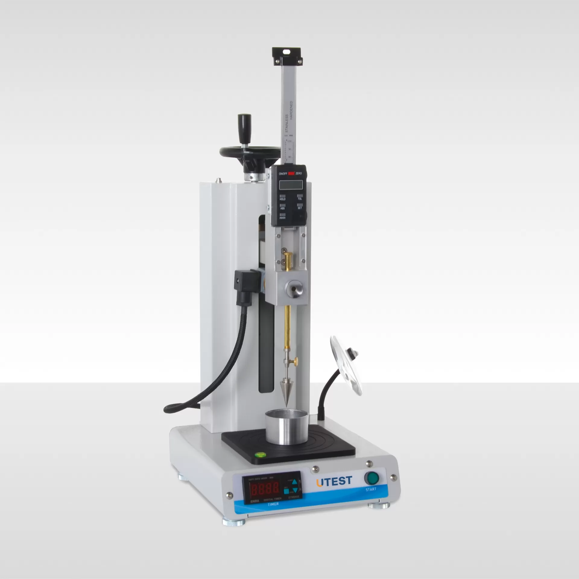 UTS-0180 Semi-Automatic Cone Penetrometer for liquid limit consists of a frame with a levelling screws and screw gear assembly with handwheel for vertical adjustment, a digital penetration measurement gauge with 0.01 mm resolution /readibility, a digital timer, a magnifying lens and a low voltage illuminator mounted on flexible arms.