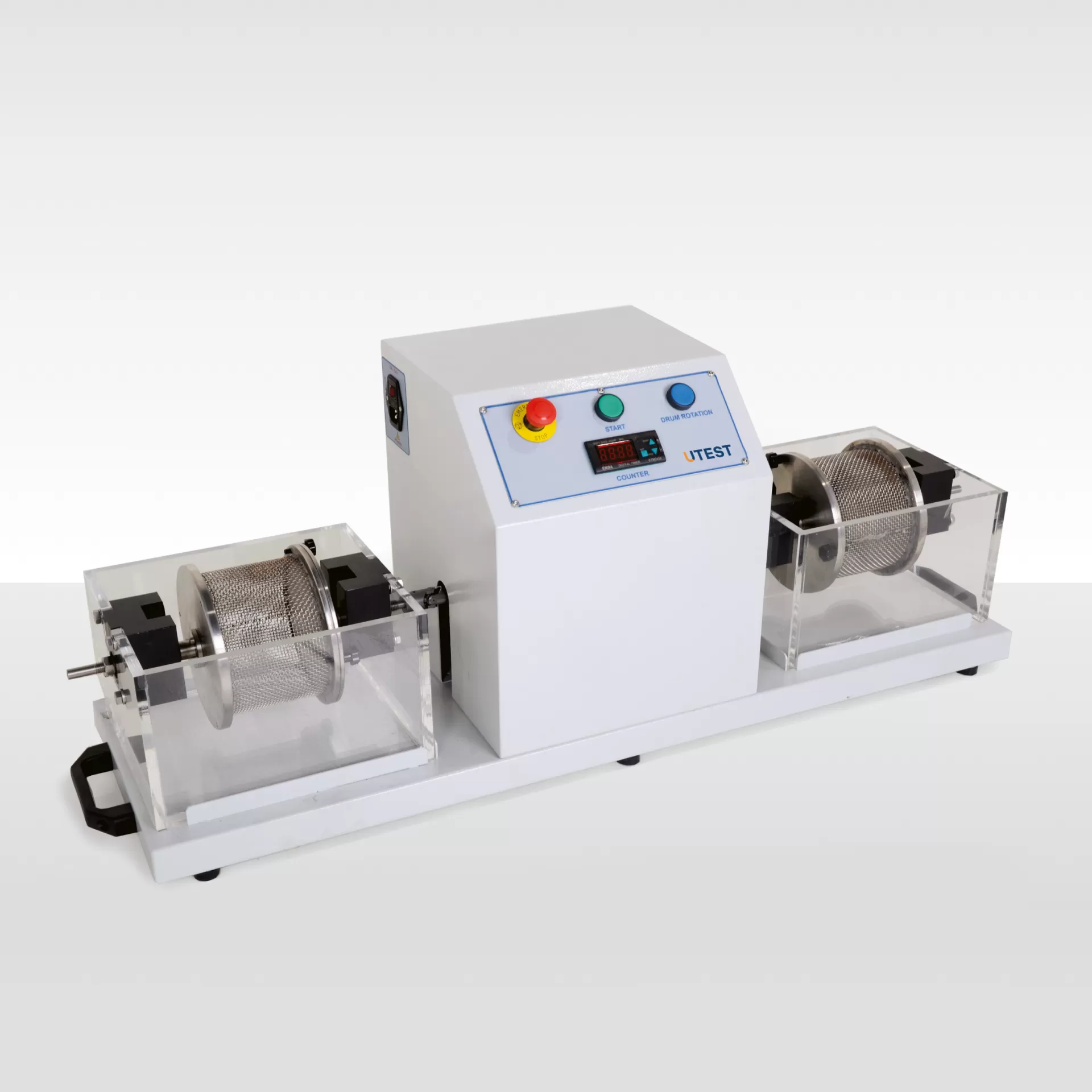 The UTR-0390 Slake Durability Apparatus consists of a motorized drive unit which is mounted on a baseplate and which can rotate two or four drums at a speed of 20 r.p.m. The tank assemblies are filled with water to a level 20 mm below the drum axis. The test drums are manufactured from 2.00 mm mesh, 140 mm dia. x 100 mm long.